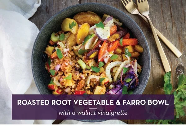 A medley of hearty, winter root vegetables are roasted to perfection in this colorful bowl packed with healthy nutrients -- all without sacrificing flavor! Paired with chewy, nutty farro, and drizzled with a warm, walnut vinaigrette, this bowl makes for a powerful meal that’s perfect for kickstarting the New Year!