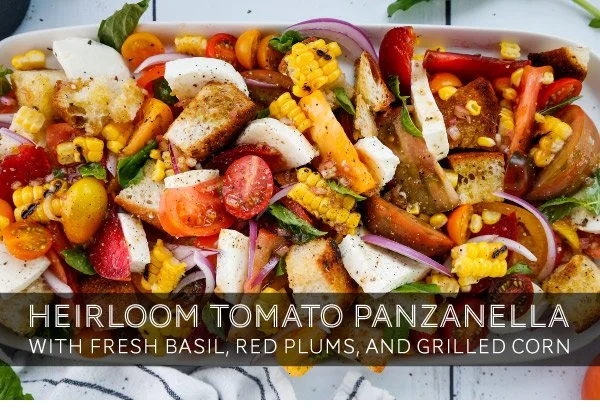 Heirloom Tomato Panzanella with Fresh Basil, Red Plums, and Grilled Corn