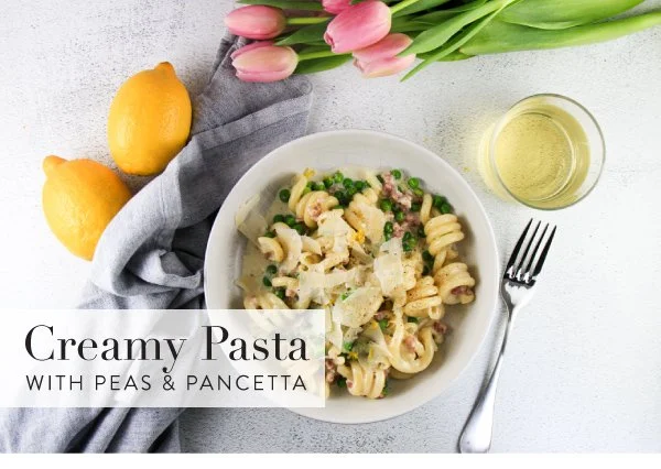 Creamy pasta with peas and pancetta is the perfect dish for spring! Featuring crispy pancetta, sweet peas, bright lemon, and a rich parmesan cream sauce, we love how this recipe is easy enough for a weeknight, but also fancy enough to serve to guests any night. Delicious!